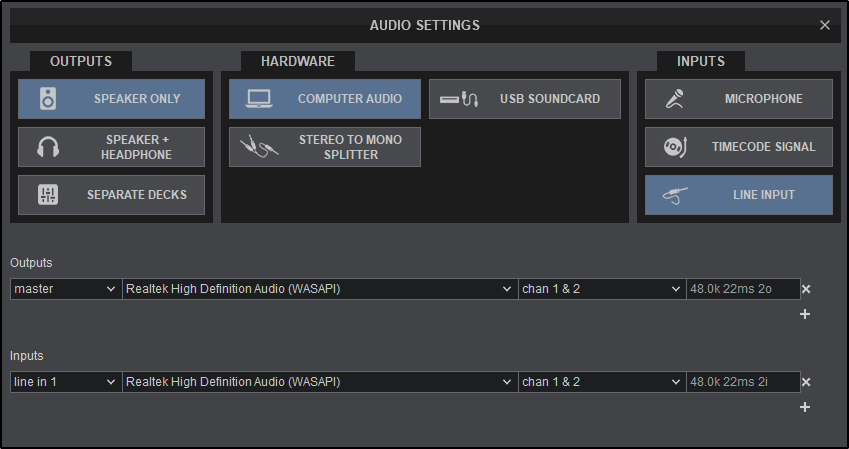 Click on the LINE INPUT button or click on the button from the inputs menu of the Advance settings. VirtualDJ will then create an additional line in the Audio Setup, using the default input device of the computer. Choose a different sound card (in case a multi-channel USB sound card is used) from the drop-down menu of the SoundCard field. Click APPLY to save these changes.