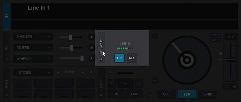 With a Line-In enabled, clicking on the REC button will record the file to memory and temporarily save it to the deck. Once a new file is loaded to the deck, the temporary recording will be erased.