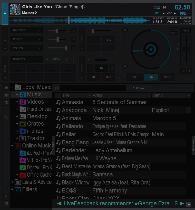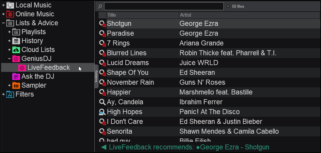 LiveFeedback will provide a recommendation in the bottom of the File List section. Clicking on the arrows on either side of the recommendation will cycle through other common selections. Clicking on the recommended track will populate the file list with search results from your local database, and/or the Online Music catalog.