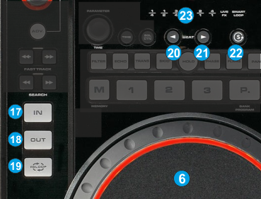 IN. Press this button to set a Loop In (Entry point). Hold TAP(S) down and then press this button to set the Jogwheel to Loop In mode and (fine) adjust the Loop In point using the jog (6) when a loop is enabled. The Led of the button will blink to indicate the Loop In Wheel mode. Press again to return the Jogwheel to Jog mode.