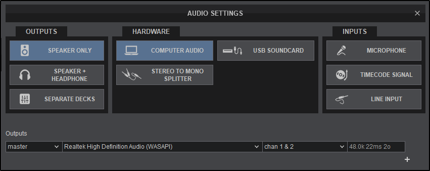 VirtualDJ will auto-configure an Audio Setup for Master Output only, on first launch. This Audio Setup is designed to use the SPEAKER ONLY and the COMPUTER AUDIO options since the hardware is consistently available and very common.