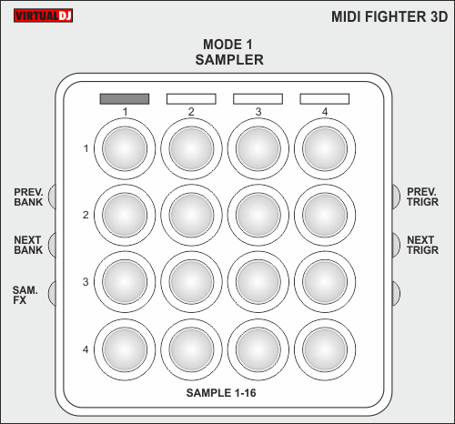 BUTTON 1_1 to 4_4Trigger Sample 1 to 16 of the loaded Sampler BankLEFT SIDE TOPLoads the previous available Sampler BankLEFT SIDE MIDLoads the next available Sampler BankLEFT SIDE BOTTOMTriggers the selected Effect on Sampler outputRIGHT SIDE TOPSelects the previous available Sampler Trigger Mode (Stutter, On/Off, Hold and Unmute)RIGHT SIDE MIDSelects the next available Sampler Trigger Mode (Stutter, On/Off, Hold and Unmute)RIGHT SIDE BOTTOMUn-assigned Mode 2