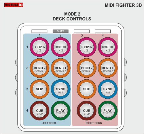 Press the 2nd MODE button on the Midi Fighter 3D (led will be turned on) to set the device to MODE 2. In this mode you have the most basic Deck Controls for Left/Right Decks
