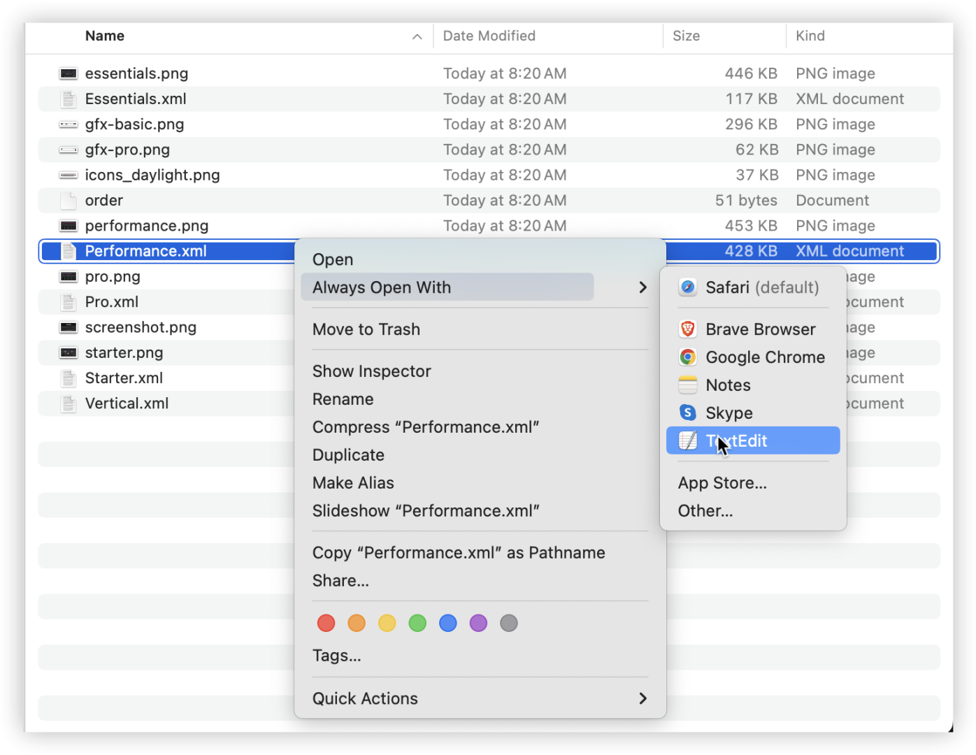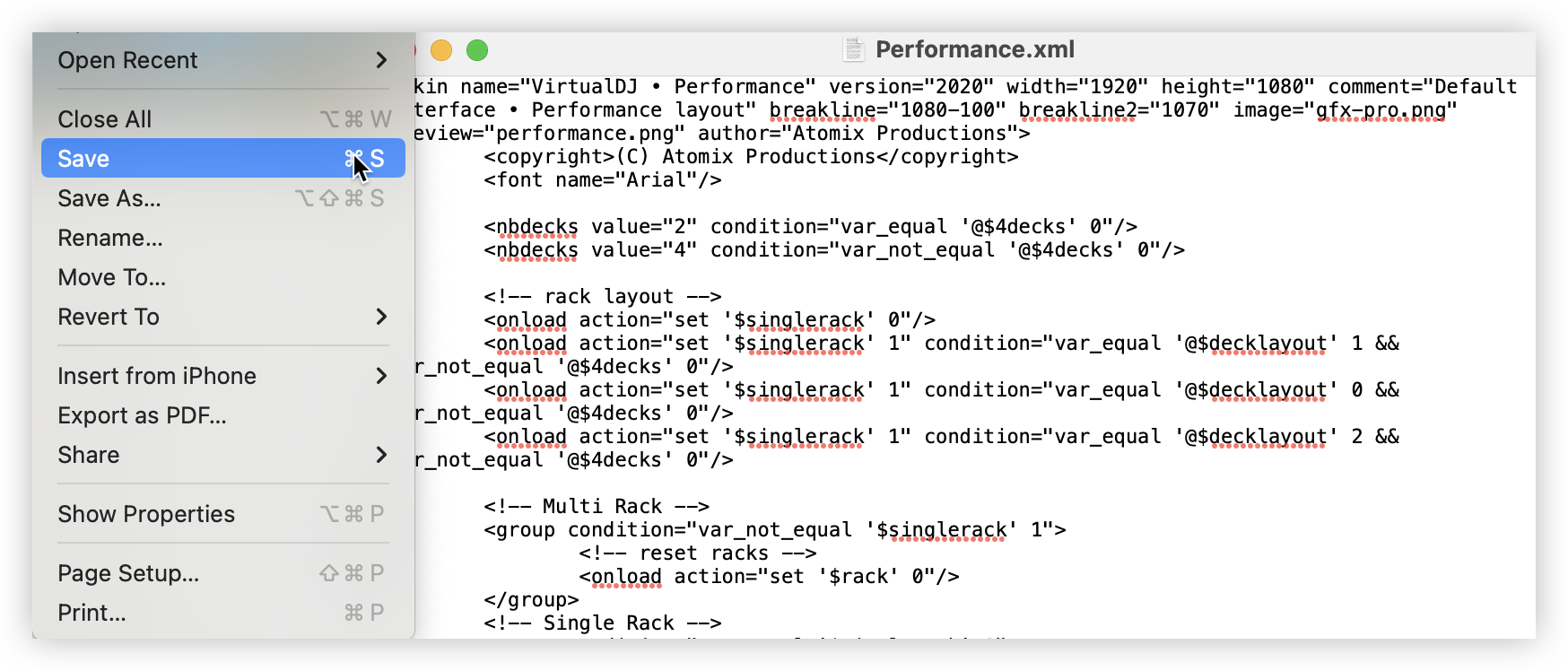 4. The root skins folder (VirtualDJ/Skins) on your computer will automatically open. Right click on the XML file that you wish to edit and select Open With > to access a Text Editor (NotePad, WordPad, TextEdit, etc.) to open the file.