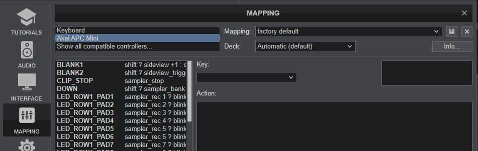The unit should be visible in the MAPPING tab of VirtualDJ Settings and the “factory default” available/selected from the Mappings drop-down list. The factory default Mapping offers the functions described in this Manual, however those can be adjusted to your needs via VDJ Script actions.