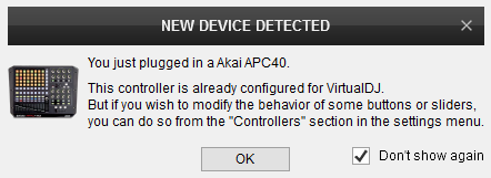 A detection window will appear when the unit is first connected with VirtualDJ, verifying proper connection.