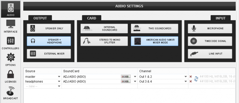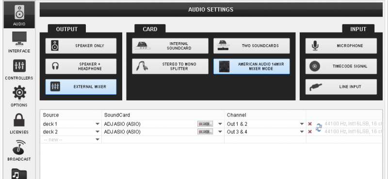 The following audio configuration will be created and the Timecode on/off buttons will appear on the VirtualDJ GUI.