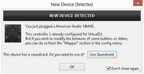 A detection window will appear next, asking to use or not the pre-defined audio setup (for the Mixer mode) with the built-in sound card of the 14MXR. The audio configuration for the Controller mode needs to be manually created.