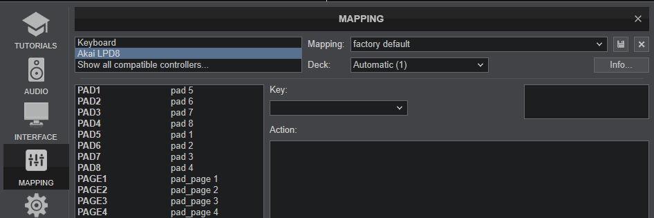 The unit should be visible in the MAPPING tab of Config and the “factory default” available/selected from the Mappings drop-down list. The factory default Mapping offers the functions described in this Manual, however those can be adjusted to your needs via VDJ Script actions.