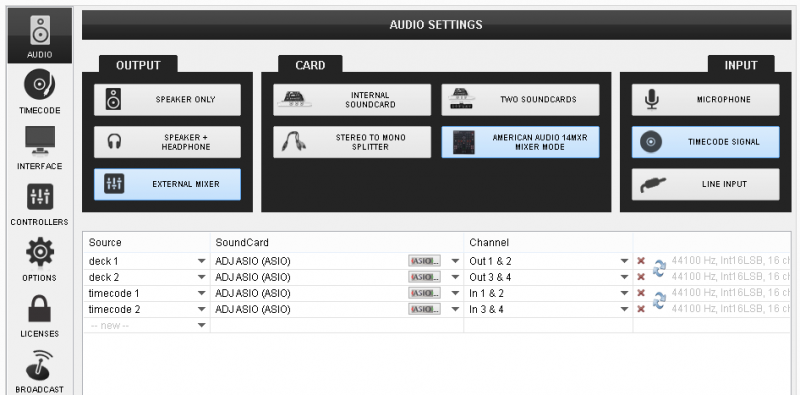 The following audio configuration will be created and the Timecode on/off buttons will appear on the VirtualDJ GUI.