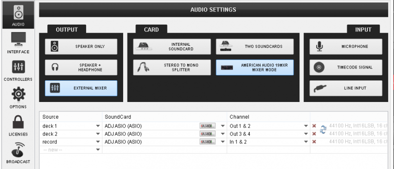 The American Audio 19MXR does not offer the ability to record or broadcast your mixing internally. However, recording & broadcasting (including the Microphone inputs) is possible in both Mixer and Controller modes, by following the way described below.