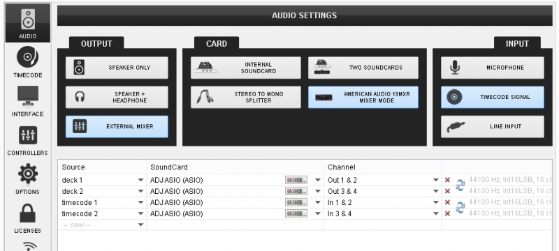The following audio configuration will be created and the Timecode on/off buttons will appear on the VirtualDJ GUI.