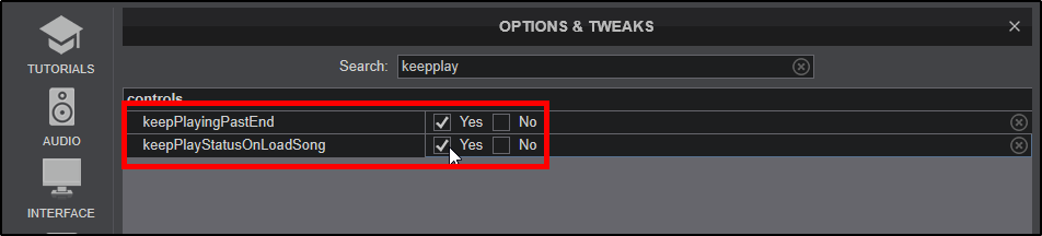 • Select YES for keepPlayStatusOnLoadSong if you wish for a song to automatically play if loaded to an already playing deck.