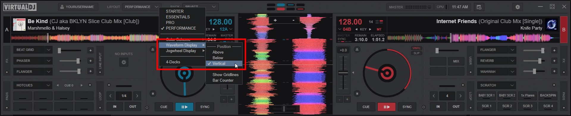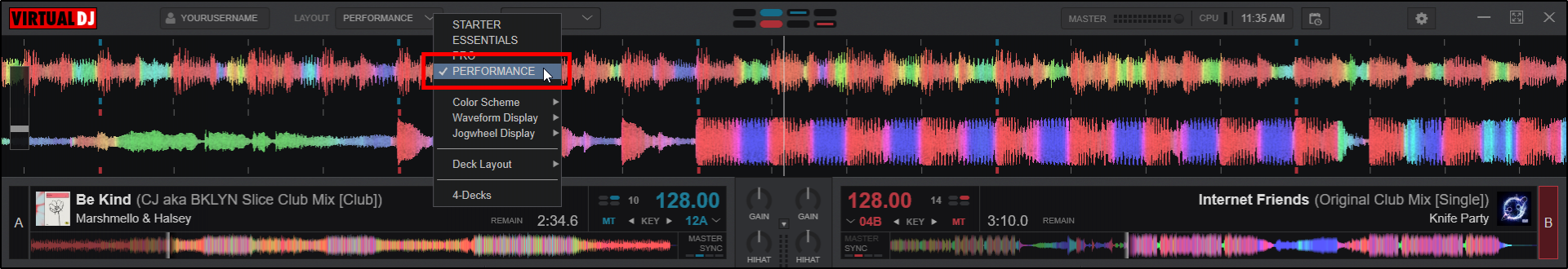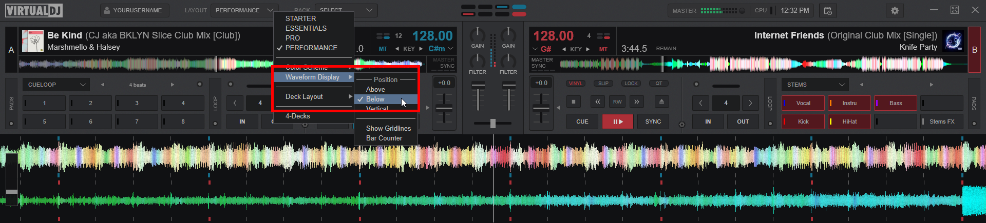 In the PERFORMANCE layout the waveforms automatically default to the neutral color vs the traditional Blue/Red of VirtualDJ. The waveforms remain in a horizontal position, but can easily be changed to a vertical position by going to LAYOUT>Waveform Display and selecting Vertical or Below as the position