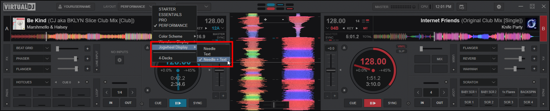 The Jog Wheel appearance can also be altered to provide a more familiar look. Once again, going to the LAYOUT drop down, select Jogwheel Display and choose Needle+Text to change the appearance.