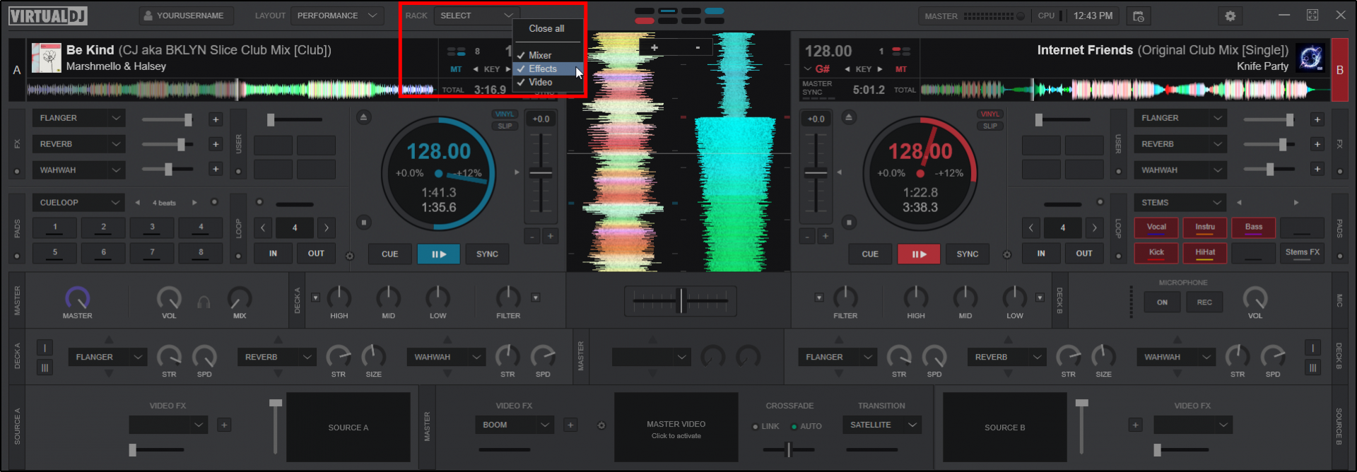 Different Racks can be added or removed depending on how you want the software configured. Go to the RACK dropdown and select or deselect from Mixer, Effects, and/or Video to add or remove a Rack. The option to 'Close all' is also available to remove all racks from the display.