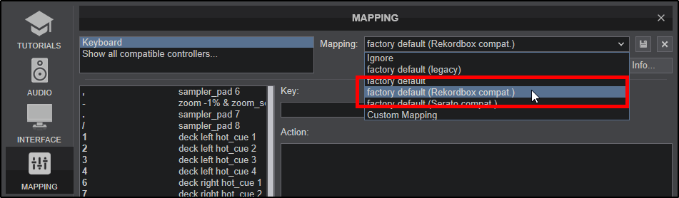 Head to VirtualDJ Settings>MAPPING tab, click to select the Keyboard from the top-left devices list. Then select the "factory default Rekordbox Compat." mapping from the drop-list on the right side.