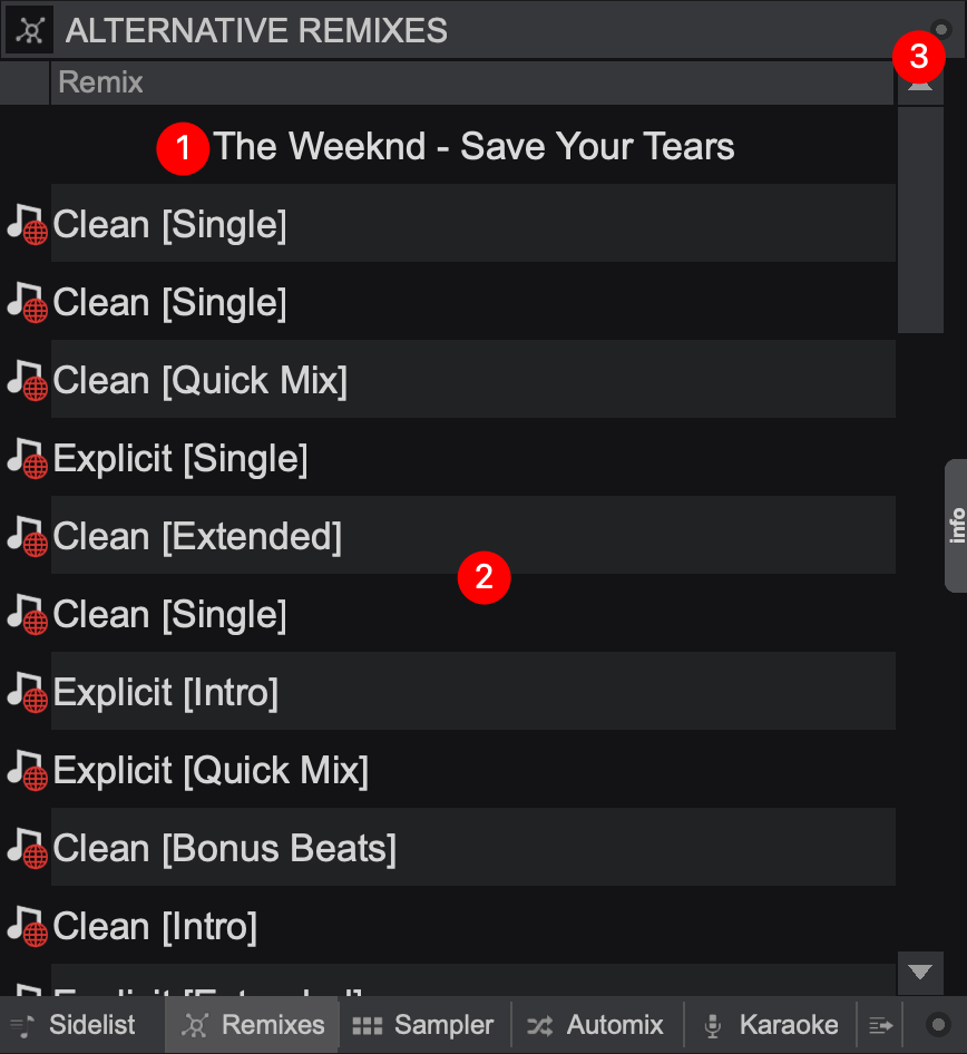 - TRACK NAME. Displays the highlighted track in the browser when the "Alternative Remixes" option is selected.