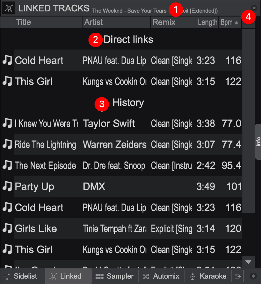 BACKWARD LINKS - Displays tracks that have the selected track set as a Direct Link. - HISTORY. The history list is based on track relevance with the most relevant at the top and least relevant at the bottom. It will display tracks played up to 5 tracks before or after the selected track historically. Tracks played just after the selected track always take the highest priority, while tracks that are played together more often will increase in priority.