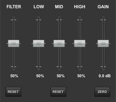 EQUALIZERAt the bottom of each set of sliders, a reset button (zero for gain) can be found to bring any of the adjusted parameters back to their neutral positions quickly.