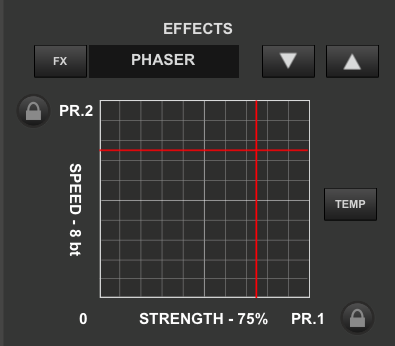 EFFECTSEffect parameters are controlled by touching and dragging the XY Pad with the added capability of locking one or both of the parameters into position by using the lock icons.
