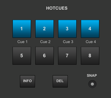 HOT CUESThe INFO button will cycle through the Cue’s stored information on each press to display Cue Names, Cue Time Position, or Beats.