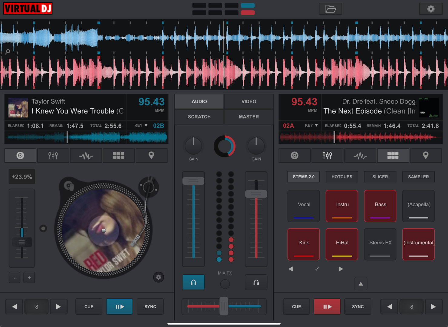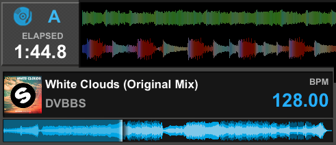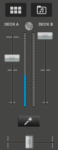 In Deck View, Volume faders and VU Meters for both decks are available.