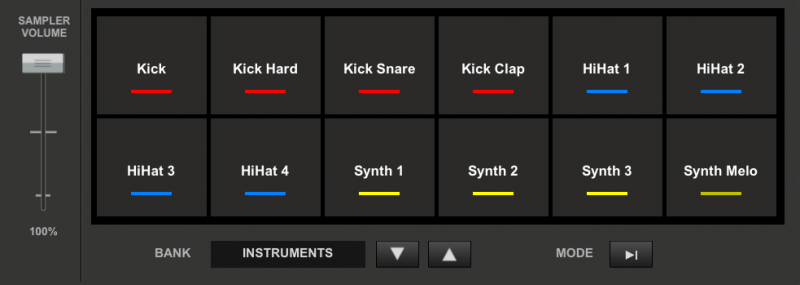 The Sampler offers 12 sample pads with a sampler volume fader for quick triggering and adjustment. Any Sample Bank created in the program can be accessed by using the Up and Down arrows to cycle through the banks and the Trigger Mode can be cycled for the Bank by tapping the Mode button.