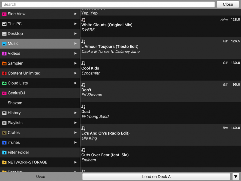 The Browser provides full accessibility of the entire library of files on the host computer. Files can be searched by using the large Search Bar at the top and loaded to a deck or Side View panel using the Load button at the bottom.