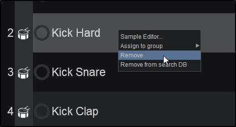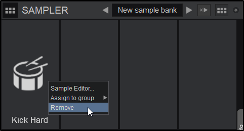 - To remove a Sample, right-click on a Sample in the File List when the required bank is selected from the Folder List or from the Sampler sideview (if List view is selected) and choose Remove.