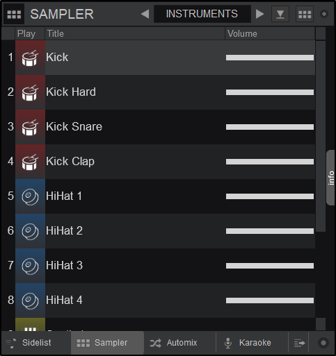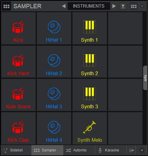 The Sampler view of the Sideview offers 2 different views; a Trigger Pad and a List View. The Trigger Pad view offers large buttons (pads) to trigger a Sample, with an icon, the name and a progress bar. The List view also offers all possible information (Volume, Group name, Mode, Color, etc). You may also choose which fields you wish to see in the List View by right-clicking on the header. Click on a Sampler Pad or use the Play field in List view to trigger/play/stop a Sample.