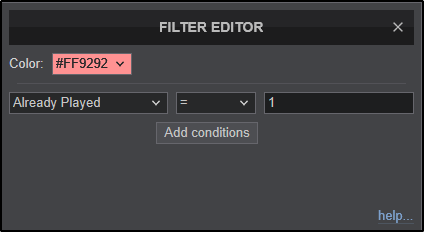 In this example the end goal is to display all tracks that have been played to be highlighted in red. So the field selected in the first box is Already Played. In the second box = is selected. And finally in the 3rd box a value is added (1 in this case).