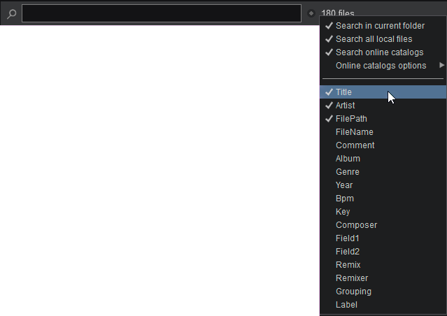 The Browser area offers a Search input box on the top. This is used to search and find files within your media library without browsing within the folders. VirtualDJ will automatically add files to the Search Database whenever a folder is focused on (opened in the Folder List) for the first time and keep the results in the database.