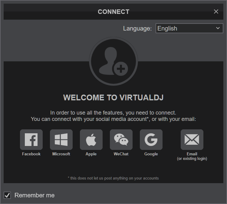 Once VirtualDJ is launched, a Connect Window will appear. Please login with your preferred method from the ones provided.