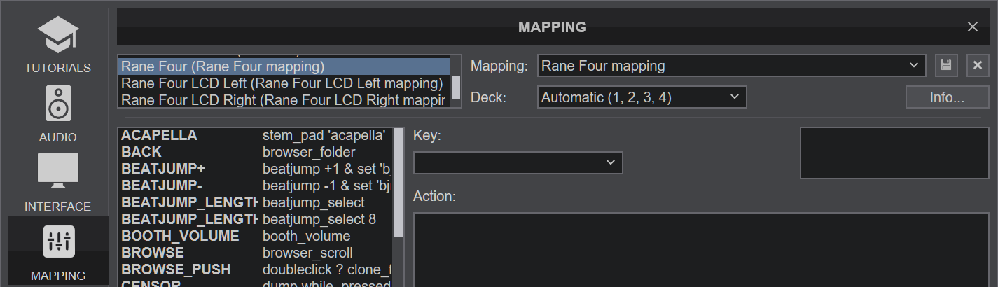The unit should be visible in the MAPPINGS tab of Config and the “factory default” available/selected from the Mappings drop-down list. The factory default Mapping offers the functions described in this Manual, however those can be adjusted to your needs via VDJ Script actions.