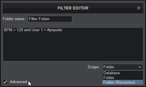 Clicking on the Advanced checkbox will provide the ability to create more complex and advanced filters and will display a Scope Menu. The scope menu will allow either results from the entire database, the folder itself or from its sub-folders (recursive) depending on the selection made.