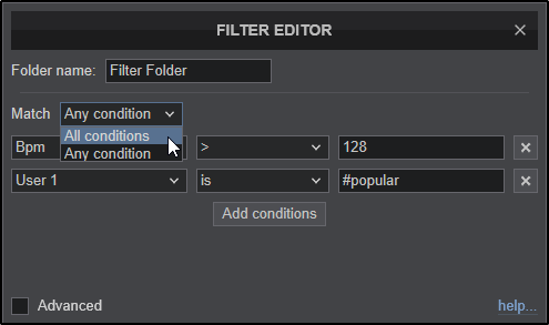 When additional conditions are added a Match submenu will appear. The dropdown will provide the option to select if the filter can operate if any condition is met or if all conditions are met.