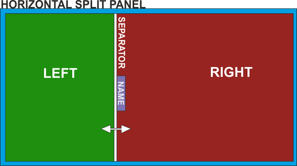 - size="" : Define the width (for horizontal) or height (for vertical splits) of the separator area in pixels. If not any "special" separator button is defined (see below), the size defines how large the name of the split panel will be displayed on the default separator button.