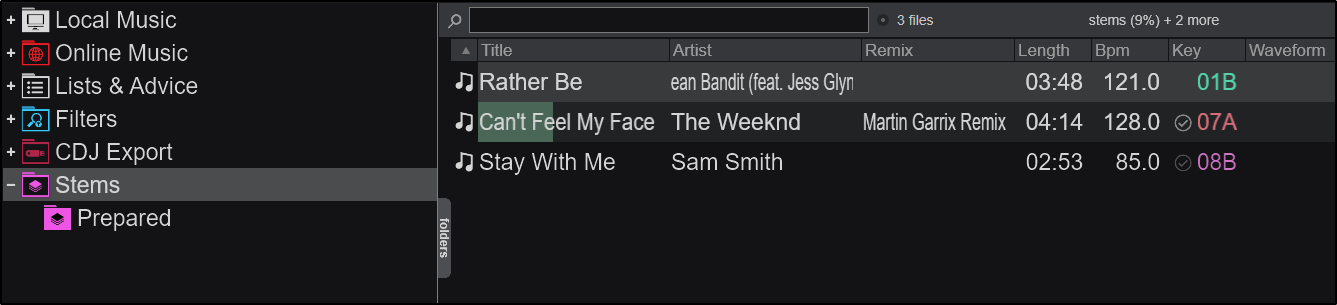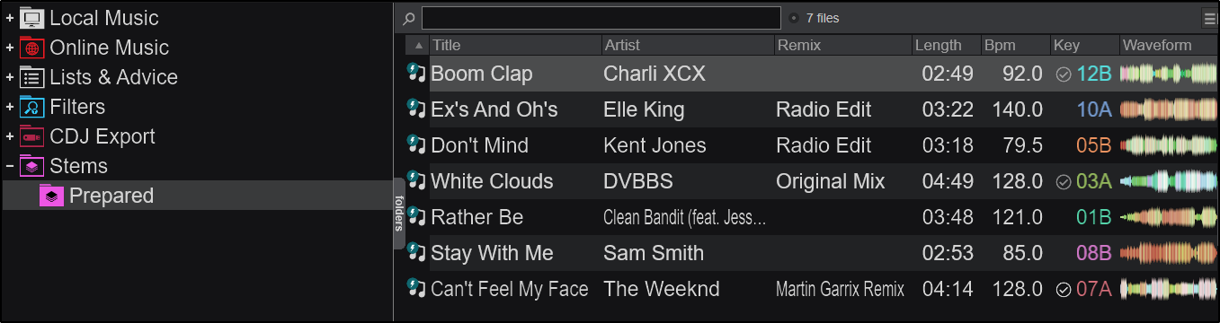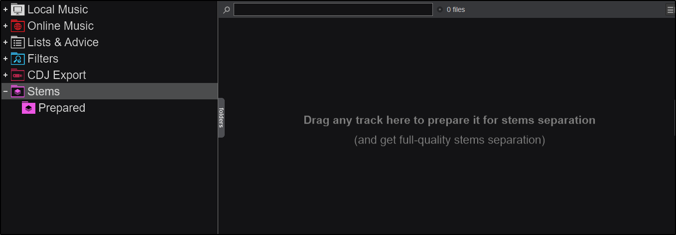 The Prepared sub-folder will display all the tracks that have been analyzed for stems and are ready to be used with stems in the decks.