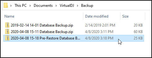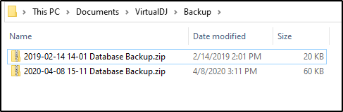 VirtualDJ will automatically create a backup zip file of your Database, History, Playlists, Filters, Mappers, Events, Pads, and Virtual Folders. Once the backup is complete, Documents/VirtualDJ/Backup will open on your desktop showing the file location where the backup has been saved.