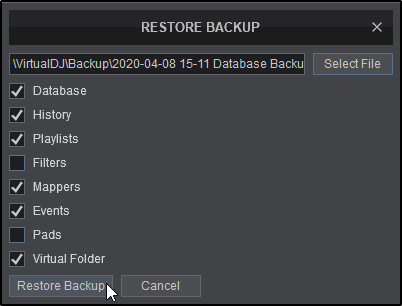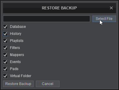 Restores database, folders, history, mappers, pads, playlists and/or settings from backups that have been created.