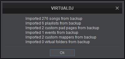 The restoration process will take a few moments. Once completed VirtualDJ will provide a summary of what has been restored. Select OK to continue.