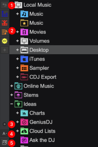 The Side Toolbar on the left vertical side of the Browser offers global folder operations and Browser features to quickly make changes and add functionality without interrupting the DJ's work flow.