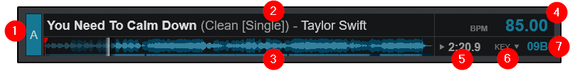 - WAVEFORM AND PROGRESS INDICATOR. Displays the track waveform with beat indicator underneath to show breaks, as well as the current position and any cue points or other marked Points Of Interest (see POI Editor).