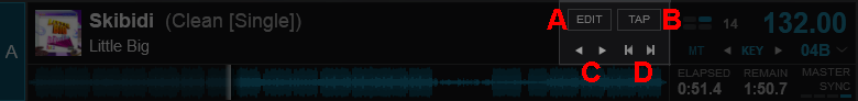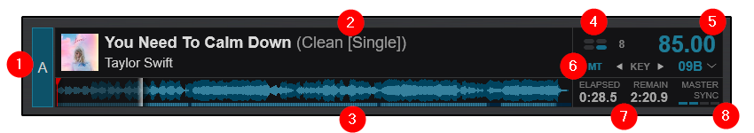 - PHRASE INDICATOR AND SYNC. This displays the current Phrase the track is on. Clicking on it will automatically sync the Phrase of the opposing deck.