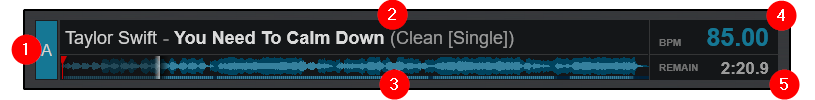 - TITLE AND ARTIST. Displays the title, artist and remix (displayed in brackets if available) of the track according to the tagged information. This information can be modified in the Tag Editor.