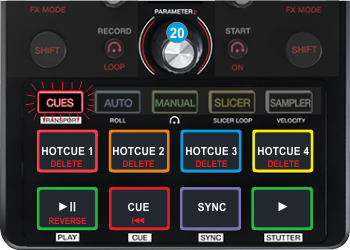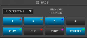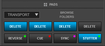 While the Hot Cue mode is selected, press the same CUES mode button again to set the PADs to Transport mode (led will blink). The Pads section of the default VirtualDJ GUI on the corresponding deck will be also set to a special Transport pad page.