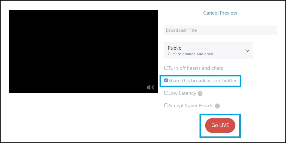- enter the title of your broadcast and mark check the option share this broadcast on twitter, then press the button go in live