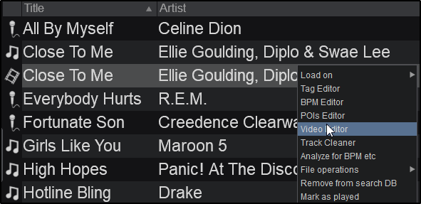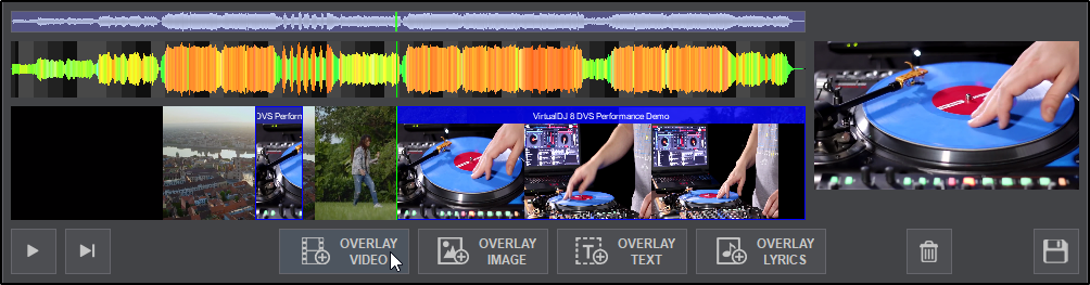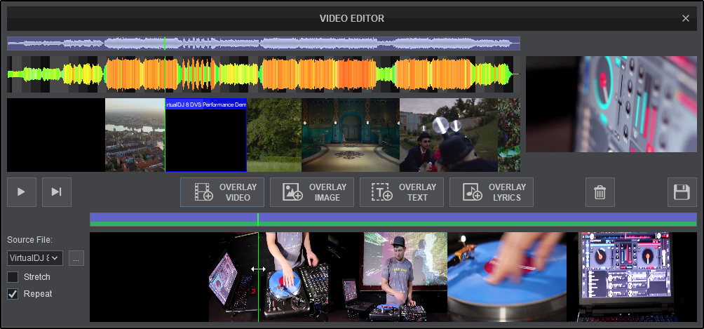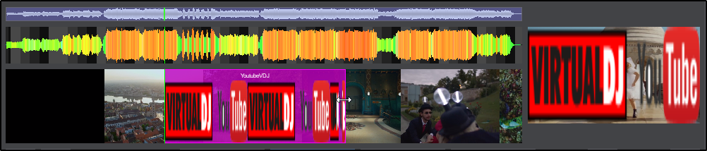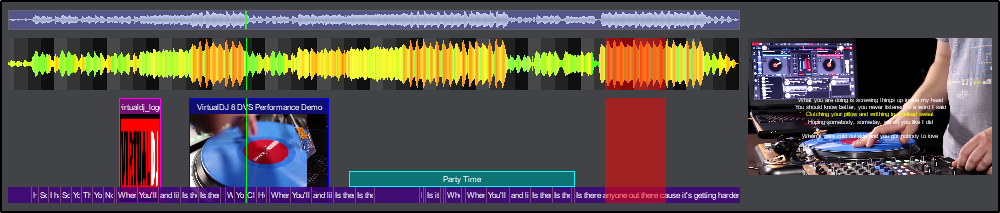 The Video Editor provides the ability to overlay video files and text over an existing Audio or Video track and is available as a Right-click option to any track in the File list. The process is non-destructive (does not alter the original file) and creates a special .vdjedit file that can be loaded to a deck and used in place of the un-edited original file.