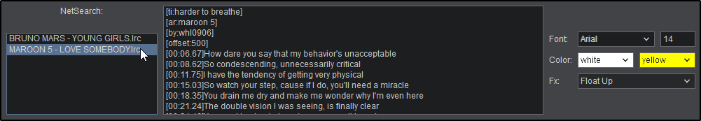 The FX section provides the ability to have the lyrics Float Up for traditional karaoke or Subtle to display the lyrics at the bottom of the video screen.